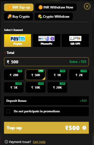 4.Choose a Payment Option: Select UPI, Paytm, Bank Transfer, or Crypto (e.g., USDT, minimum ₹700).